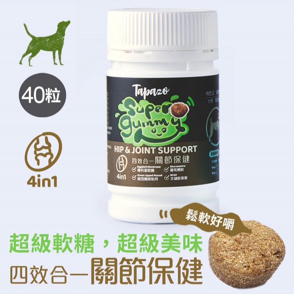 Tapazo特百滋超級軟糖─犬用關節強化配方,使用西班牙專利蛋殼膜,有效幫助關節舒適;添加紐西蘭綠貽貝、BCAA支鏈胺基酸等,滋養與維護關節組織,維持狗狗肌肉有力。美味軟糖形式,適口性佳,好吃好餵食。