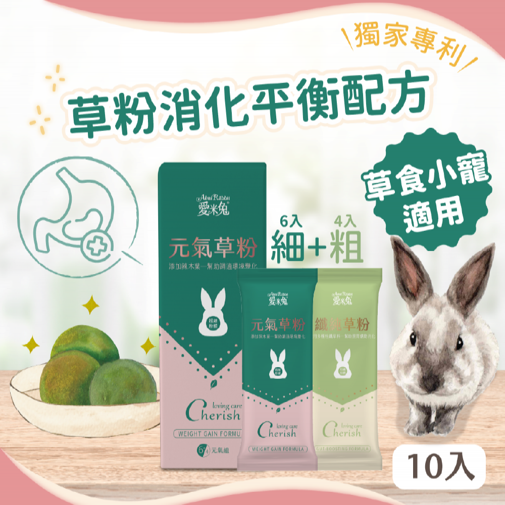 「參考兔科醫師建議:長期只食用過細的草粉,缺少可以幫助兔兔腸胃蠕動的纖維,唯有與粗纖維一同搭配食用才是最完整。」餵食草粉,粗細混搭最全面,元氣草粉 - 細x粗6+4絕配組合,不含澱粉/麩質/穀物,添加美國AES綜合酵素,幫助營養素消化吸收,更添加愛米可緹獨家專利益生菌 - PTA22™經過專利發酵後產出的【NutraCeca™專利植物乳桿菌】,幫兔兔補充草粉的同時,還能幫助建立益菌生存的生物膜,讓壞菌難以附著在腸道,雙料草粉,效果不只雙倍,照顧兔兔最給力!