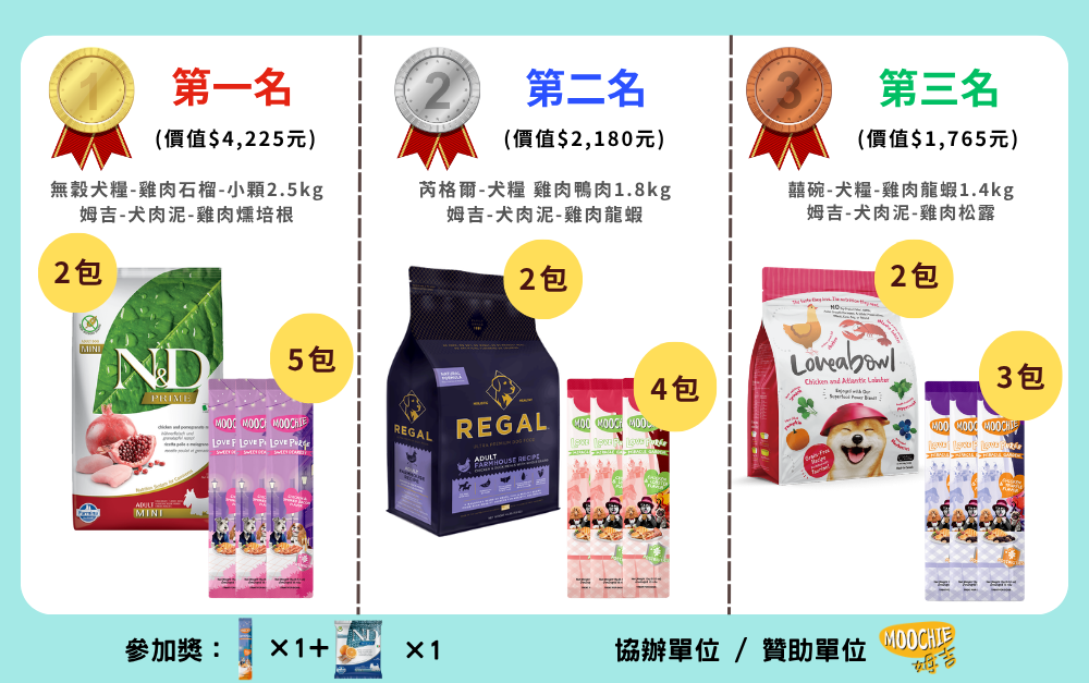 汪寶將肉泥食用完畢的同時,主人需舉手並大聲喊出指定關鍵字,即停止計秒取前三名跑最快(秒數最短)的隊伍,可獲得各式大獎。